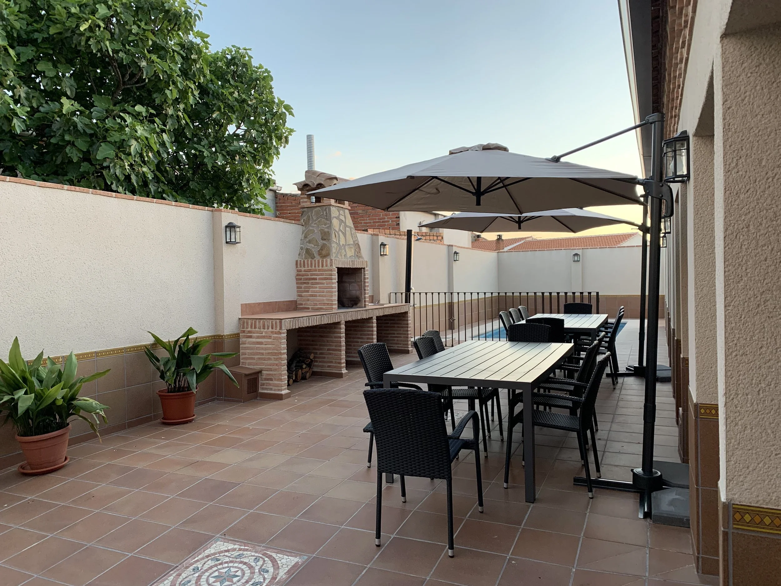 terraza con mesas, sillas, sombrillas y una chimenea exterior con ladrillos y piedra, rodeada de muro y plantas